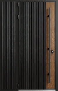 Нестандартная входная термодверь с боковой вставкой, бугельной ручкой, черными панелями МДФ со вставкой шпона КД-1453