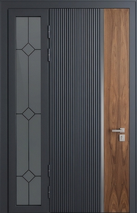 Стальная утепленная термодверь с остеклением сбоку и комбинированными панелями МДФ RAL + шпон — воплощение современного подхода к оформлению пространства. МДФ-панели позволяют реализовать индивидуальные дизайнерские решения при сохранении технических характеристик двери. Служат выразительным элементом композиции входа. Дизайн-проект подойдет для загородного коттеджа в классическом и современном стиле.